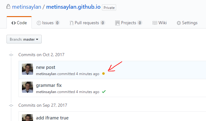 You will see a small icon next to each commit. This small icon shows progress of the page builds. If you see a yellow circle, this means your page build is on progress. If you see a green tick, this shows that last page build was successful.