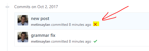 If you see a red cross this means that your page build has failed. You can click commit code button next to that line to understand where the build has failed.