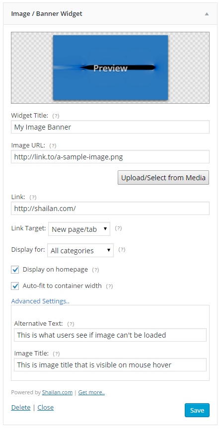 Add Images and Banners to your sidebars easily! Add title, link, alternative text, even set the link targets with one widget. No coding required!
